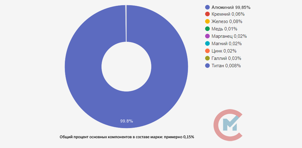 Химический состав, а также допустимое количество примесей регламентируется ГОСТ 11069-2001. В сплаве А85 содержится 99,8% алюминия, до 0,08% железа, до 0,06% кремния, до 0,03% галлия, до 0,02% магния, до 0,02% марганца, до 0,02% цинка, до 0,01% меди и до 0,008% титана. Суммарное содержание всех примесей до 0,15%.