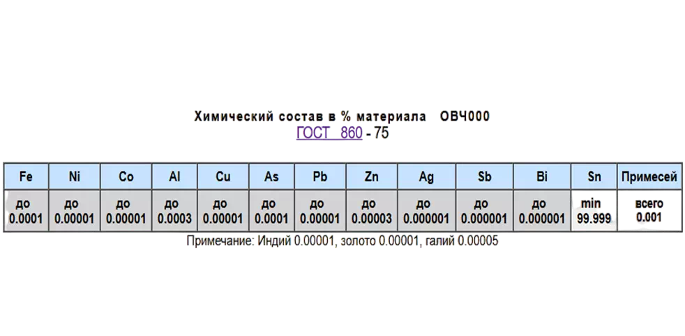 Марка ОВЧ 000 представляет собой высококачественное олово с минимальным содержанием примесей. Регламентируется стандартом качества ГОСТ 860-75.